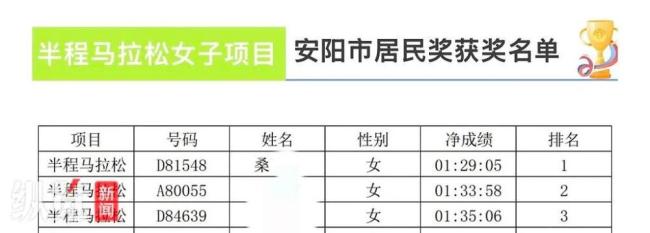 男子替跑获女子半马分组冠军 替跑行为被查实 关键词: 2026-04-17 14:08:40  新黄河 男子替跑获女子半马分组冠军 替跑行为被查实。3月22日,安阳马拉松在河南安阳市文体中心鸣枪开跑。4月14日,安阳马拉松官方公众号公布了安阳市居民获奖名单,随后多名网友指出,半程马拉松女子项目第一名获奖者的号码牌D81548在比赛中佩戴在一名男子胸前,存在替跑行为。4月17日上午,安阳市文化广电体育旅游局群体科相关负责人确认涉事选手确实存在替跑行为,并表示将取消其成绩并作出处罚。组委会公布的获奖名单显示,半程马拉松女子项目第一名获奖者为桑某某,号码D81548,成绩为1小时29分05秒。多位网友发布的现场比赛图片显示,D81548号码布佩戴在了一名身穿运动背心、戴着眼镜、手持手机的男子胸前。此前,安阳马拉松组委会公布的奖励办法中提到,女子半程马拉松安阳市民奖第一名奖金为1000元。接到网友举报后,赛事运营公司查证属实,将按照相关规定对涉事选手进行处罚,并已上报相关情况,稍后会发布通报。2026年安阳马拉松赛是河南省首场大型马拉松赛事,共有2.6万名跑者参加,级别为中国田径协会认证的A1类赛事,设有马拉松和半程马拉松两个项目。 (责任编辑:0882)